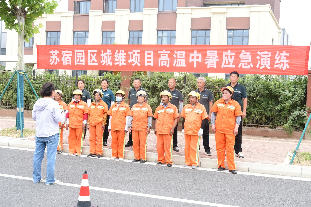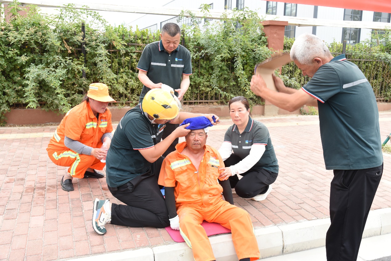 此次演練模擬鏡泊湖路一名環(huán)衛(wèi)工人在作業(yè)過(guò)程中,突然感到頭暈、心慌乏力,立即向主管人員電話求助。主管人員隨即趕到現(xiàn)場(chǎng)查看情況,發(fā)現(xiàn)環(huán)衛(wèi)工人躺坐在現(xiàn)場(chǎng),面色潮紅、大汗淋漓,精神狀況不佳,系中暑跡象,立即向項(xiàng)目經(jīng)理報(bào)告,聯(lián)系應(yīng)急救援人員,并呼喊附近作業(yè)人員將其攙扶到陰涼處,解開(kāi)衣扣散熱,應(yīng)急救援人員趕到現(xiàn)場(chǎng)后,立即用濕毛巾、酒精棉擦拭身體,涂上清涼油,喂服藿香正氣水、淡鹽水......,經(jīng)過(guò)初步救護(hù),中暑人員癥狀得以緩解后,隨即將其送往園區(qū)社區(qū)衛(wèi)生服務(wù)中心進(jìn)一步治療。