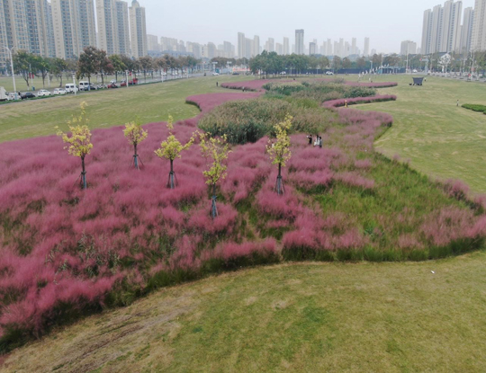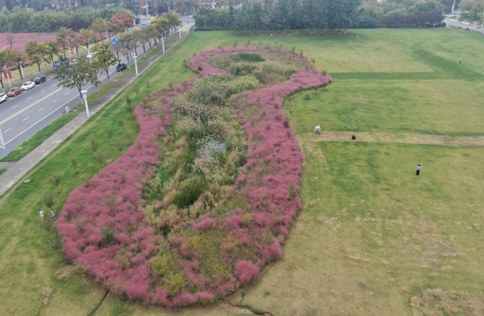 在中央商區(qū),成片的粉黛亂子草正值最佳觀賞期,云霧般的粉色花穗在陽光下輕盈搖曳,已成為市民爭相打卡的“網(wǎng)紅”景點。“粉黛亂子草觀賞性雖高,養(yǎng)護卻需格外精心。”建發(fā)公司相關負責人介紹,為維持其最佳觀賞狀態(tài),園區(qū)采取了分區(qū)、分時的精細化養(yǎng)護策略。盛花期期間,養(yǎng)護人員會精準控制澆水量,避免過多水分影響花穗形態(tài);雨季則及時排水,嚴防積水導致爛根。同時,還安排了專人全天巡視,引導游客在指定區(qū)域文明觀賞,并對局部受損區(qū)域實施“點對點”修復,確保每一株粉黛都能以最美姿態(tài),展現(xiàn)秋天的溫柔與浪漫。