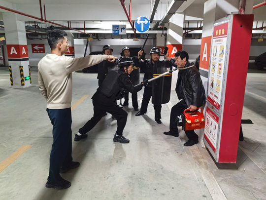 與此同時,應急處置崗隊員也攜帶防暴盾牌、橡膠棍等專業(yè)器械火速集結,以最快速度抵達地下車庫指定區(qū)域。面對負隅頑抗的 “盜竊分子”,隊員們沉著冷靜,憑借日常訓練形成的默契配合,迅速結成戰(zhàn)術小組,從不同方向對 “盜竊分子” 實施包圍,果斷出擊、動作規(guī)范,僅用數(shù)分鐘便成功將其治服,并移送公安機關處理。