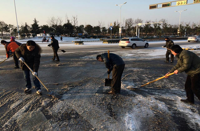 清晨6時,市政部工作人員和環(huán)衛(wèi)工人已經(jīng)開始對轄區(qū)部分主要路段進行除雪除冰作業(yè)。在凜冽寒風中,他們不畏嚴寒,經(jīng)過近3小時的清掃除冰,截至上午9時,青海湖西路、通達大道、紫金山路等主干道及蘇州公園人行道已基本完成路面積雪清掃。